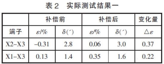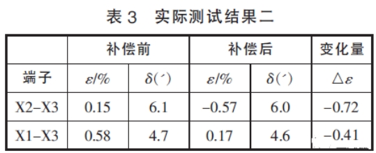 在表2和表3的實測效果中,補償前后相位差改動不大,標明本文中筆者舉薦的輔佐電壓互感器規(guī)劃結(jié)構(gòu)漏抗小,對相位差的影響可以忽略不計,與剖析效果一起。